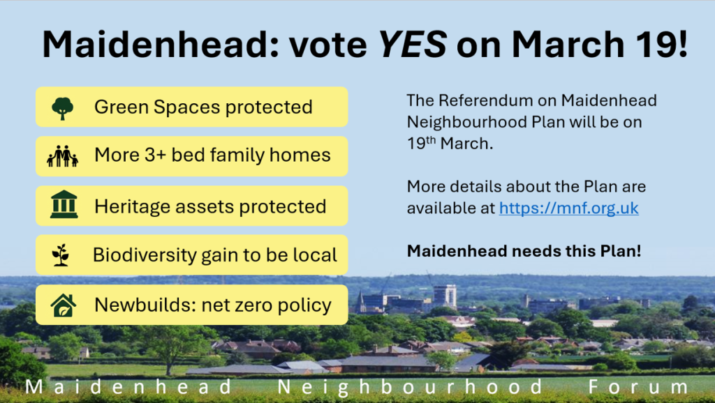 We will be encouraging people to vote in support of the Maidenhead Neighbourhood Plan!